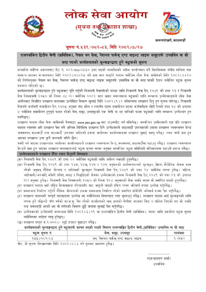राजपत्रांकित द्वितीय श्रेणी (प्राविधिक), नेपाल वन सेवा, नेशनल पार्कस एण्ड वाइल्ड लाइफ (ने.पा. एण्ड वा.ला.) समूहतर्फ उपसचिव वा सो सरह पदको कार्यक्षमताको मूल्याङ्कनद्वारा हुने बढुवाको सूचना