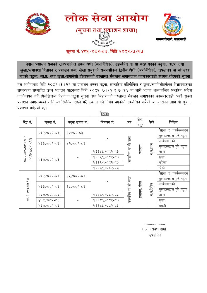 (२०८२।७।१७) सहसचिव एवं उपसचिव वा सो सरह पदको वढुवा, आ.प्र. तथा खुला/समावेशी विज्ञापनको दरखास्त संकलन लगायतका कामकारवाही स्थगन गरिएको सूचना